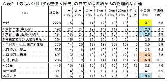 距離は地域差が著しく、3大都市圏中心部では2km以内が43%を占め、中央値は2.4km、3大都市圏の近郊・郊外では2.9kmと短い。